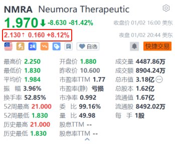 格隆汇1月3日|Neumora Therapeutics(NMRA.US)隔夜暴跌81.42%后,夜盘涨8.12%,报2.13美元。消息面上,该公司周四表示,治疗重度忧郁症实验药物未能在最后阶段研究中显示出疗效,接受navacaprant治疗的患者在忧郁症状测量方面于统计上未有显著改善。Neumora正对该药物进行另外两项最终阶段试验,并正开发其他治疗脑部疾病的药物。(格隆汇)