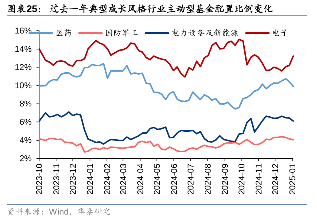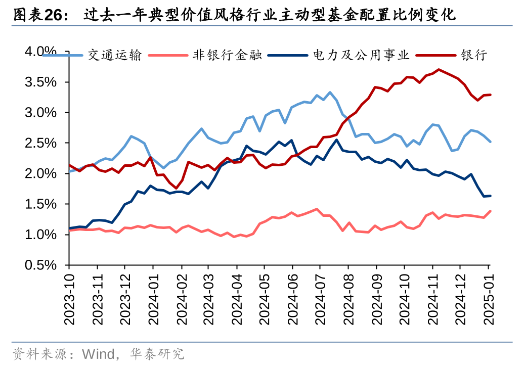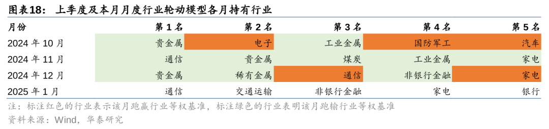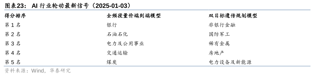 银行、非银行金融、交通运输等三个行业出现在月度行业轮动模型的最新推荐信号中。上季度AI周度行业轮动模型小幅跑赢基准,在经历10月超额回撤后,11月以来超额收益持续修复。最新信号中,银行和非银行金融分别占据两个AI子模型的榜首。上季度公募主动型基金因追涨成长风格,在行业轮动层面取得了负超额,主动型基金各行业配置比例的变化对2025Q1的参考意义有限。综上所述,行业轮动模型当前更看好红利类行业。