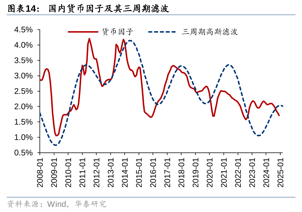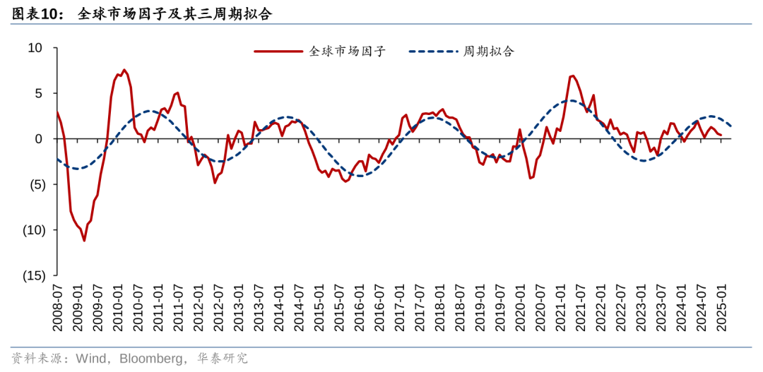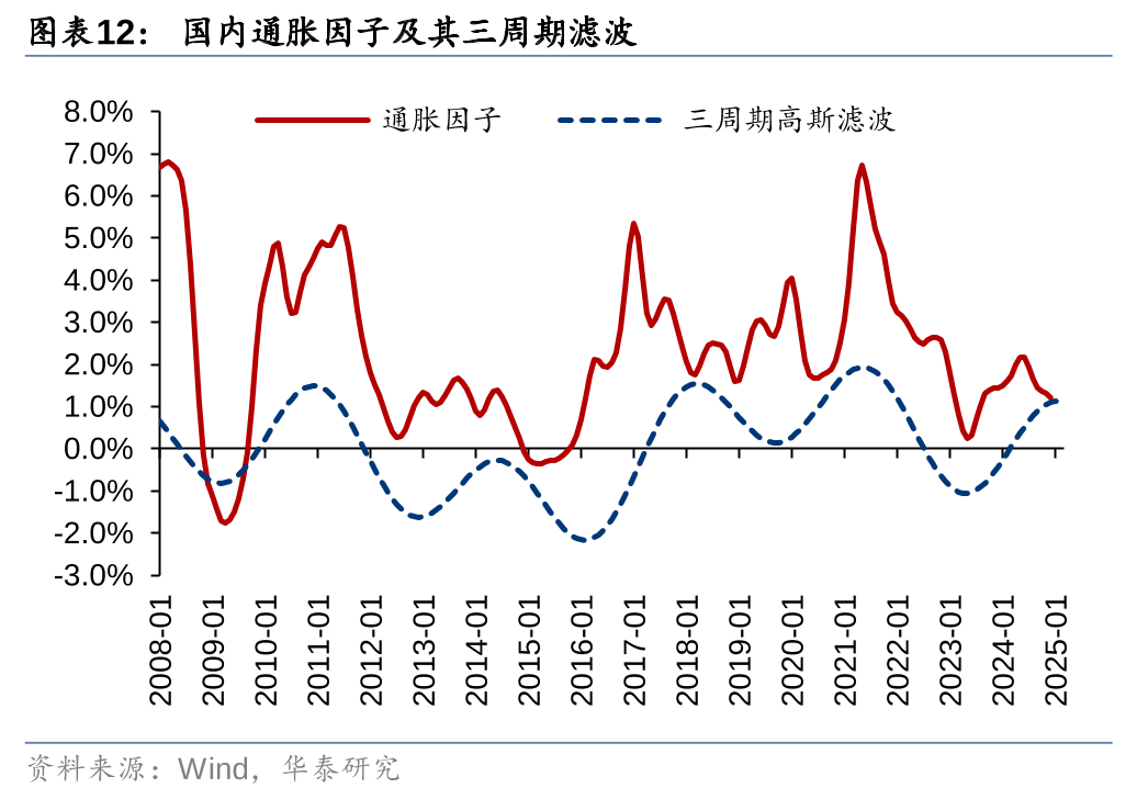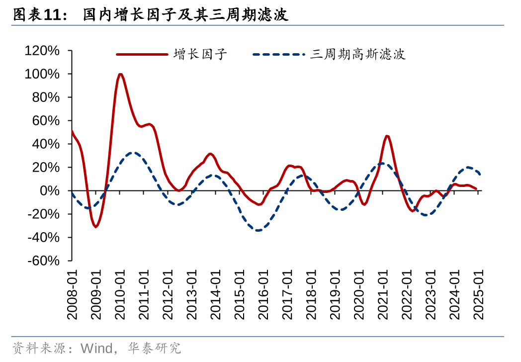 在《全球大类资产配置的三层次逻辑及对宏观基本面量化的思考》(2024-11-29)等多篇前期报告中,或多或少都提及过全球经济周期模型。简单来说,首先对全球典型的股票、利率、商品、外汇的同比序列开展主成分分析,然后对股、债、商、汇第一主成分序列之和依次开展傅里叶变换、42/100/200个月的高斯滤波、逆傅里叶变换,并外推三个月,就能得到如图表10所示的三周期拟合曲线。