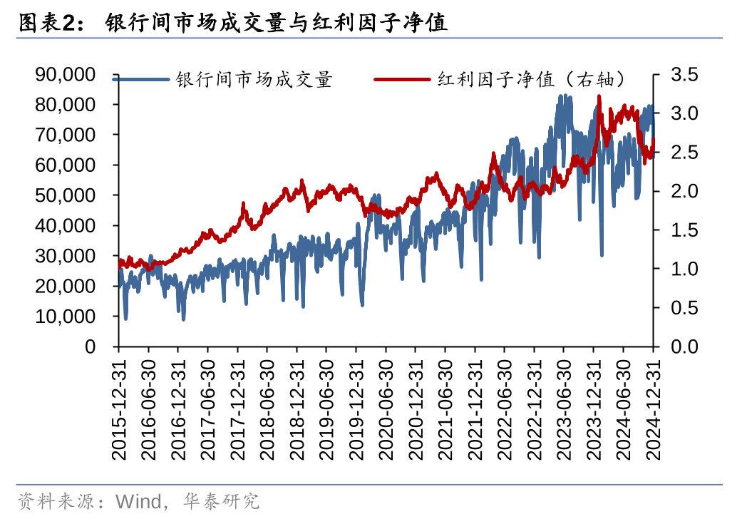 不难发现红利因子净值走势较为温和,鲜有急涨急跌,所以对于红利因子更适合从趋势入手开展择时。趋势指标既包括资产自身的趋势和宏观环境的趋势。对于后者,我们主要从自上而下逻辑出发,精选了期限利差(Wind代码S0059749-S0059744)和银行间市场成交量(Wind代码M0041739)两个指标。首先,这两个指标都是日频指标,基本能够满足定量研究“大数定律”的要求。其次,红利资产受益于“资产荒”的环境,而这两个指标在一定程度上能够指示“资产荒”的程度——若银行间市场成交量呈放大趋势,说明资金在银行间市场空转,找不到投资出路;反观若期限利差呈走阔趋势,说明“借短买长”的长期投资开始有利可图。因此,银行间市场成交量放大利好红利资产,期限利差走阔利空红利资产。