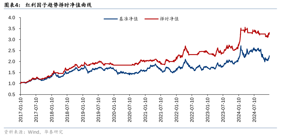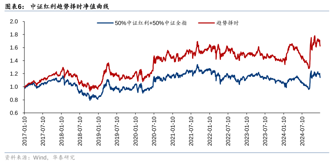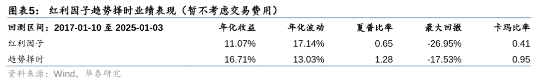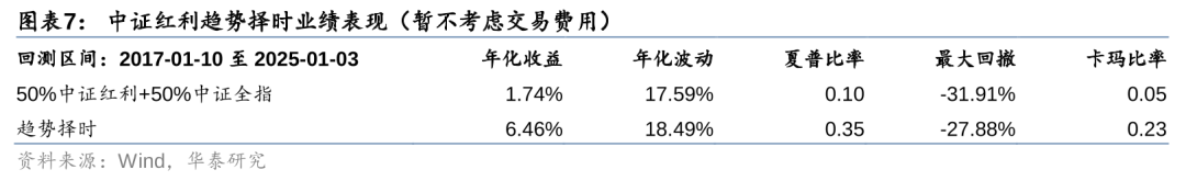 当然,我们也可以把回测对象改成中证红利指数。如果直接对中证红利指数开展择时,可能会受到A股大盘的干扰。对此,我们设择时基准为“50%中证红利+50%中证全指”。当得分之和首次≥+1时,满仓中证红利指数;当得分之和回落至-1及以下时,满仓中证全指指数;其余情况维持基准。回测结果显示,在中证红利场景下,趋势择时同样显著优于基准,年化收益提升了4.72 pct,最大回撤降低了4.03 pct。
