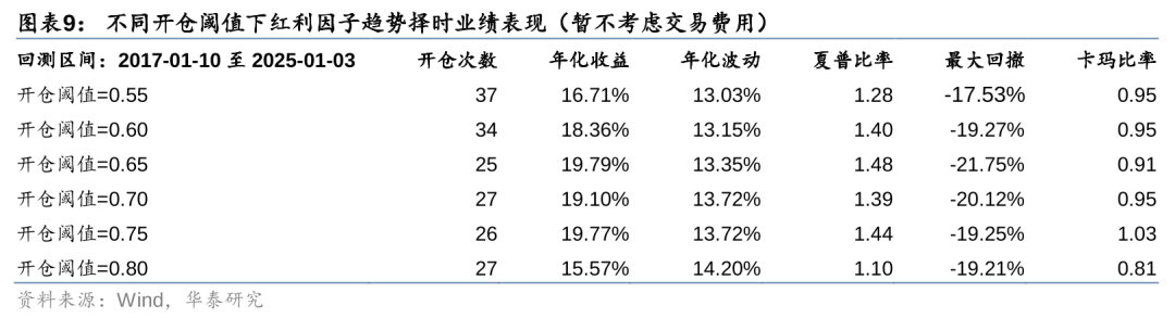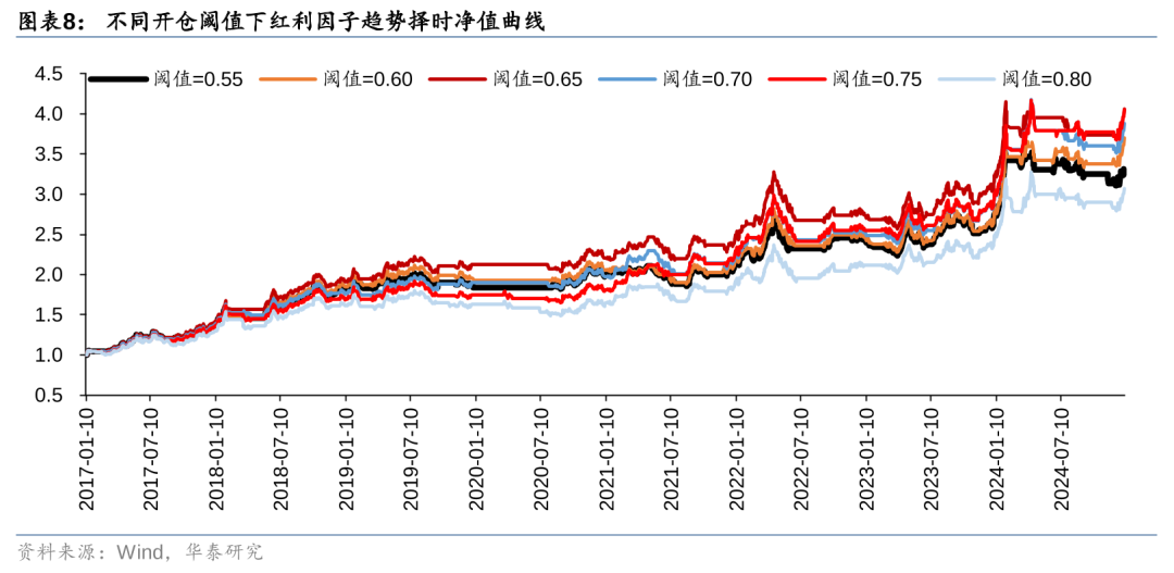 开仓阈值是一个重要的参数。对此,我们在红利因子趋势择时的场景下,开展了参数敏感性分析,我们将开仓阈值从0.55依次提升至0.60/0.65/0.70/0.75/0.80。结果显示,当阈值等于0.60/0.65/0.70/0.75时,回测表现均比阈值等于0.55时要好,而且开仓次数也进一步下降,表明开仓阈值较为鲁棒。
