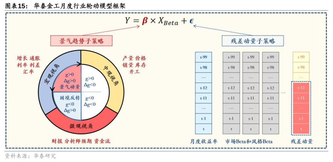 华泰金工月度行业轮动模型从因子定价模型出发。行业表现可以被拆分为由市场Beta和风格Beta所解释的部分以及残差。针对Beta部分,前期报告《行业景气投资的顶层设计和落地方案》(2023-09-14)结合宏观、中观、微观三个视角来捕捉行业盈利能力g和盈利能力边际变化Δg均大于零的机会,构建了景气趋势子策略。残差部分是无法被市场Beta和风格Beta所解释的部分,可能蕴含着如技术进步、政策支持等行业专属信息。前期报告《行业残差动量定价能力初探》(2024-02-05)采用技术分析来捕捉行业专属信息的异动,构建了残差动量子策略。从统计学原理来说,Beta部分和残差部分是不相关的,实证中两个子策略的长期相关性也较低。最终,我们把两个子策略按信号进行等权融合,每月推荐五个行业等权配置。回测程序使用每月第一个交易日各行业指数的收盘价完成调仓和净值计算。