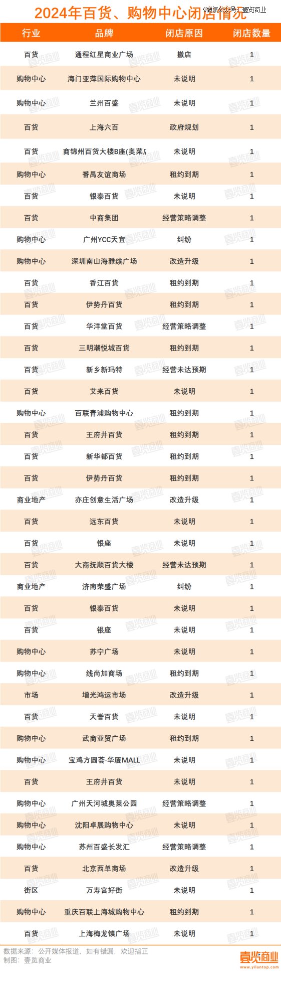 从这41家门店经营发展情形来看,租约到期是关闭的主要原因。如武商集团亚贸广场购物中心、重庆百联上海城购物中心、重庆王府百货、天津南京路伊势丹百货等项目。