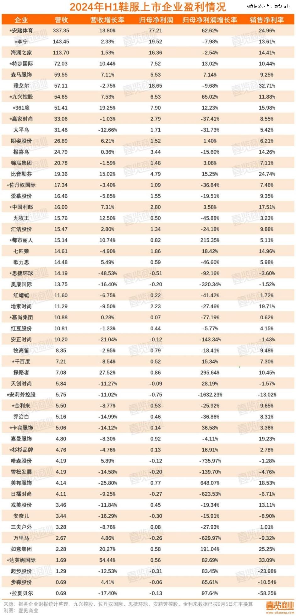 此前,壹览商业统计了52家上市鞋服企业2024年上半年业绩,这52家鞋服上市公司实现总营收1349.18亿,同比增长3.17%;归母净利润191.93亿,同比增长22.85%;销售利润率14.89%。其中,有39家企业营收增速未能跑赢大盘,13家企业亏损,仅有13家企业实现营收、利润双增长。