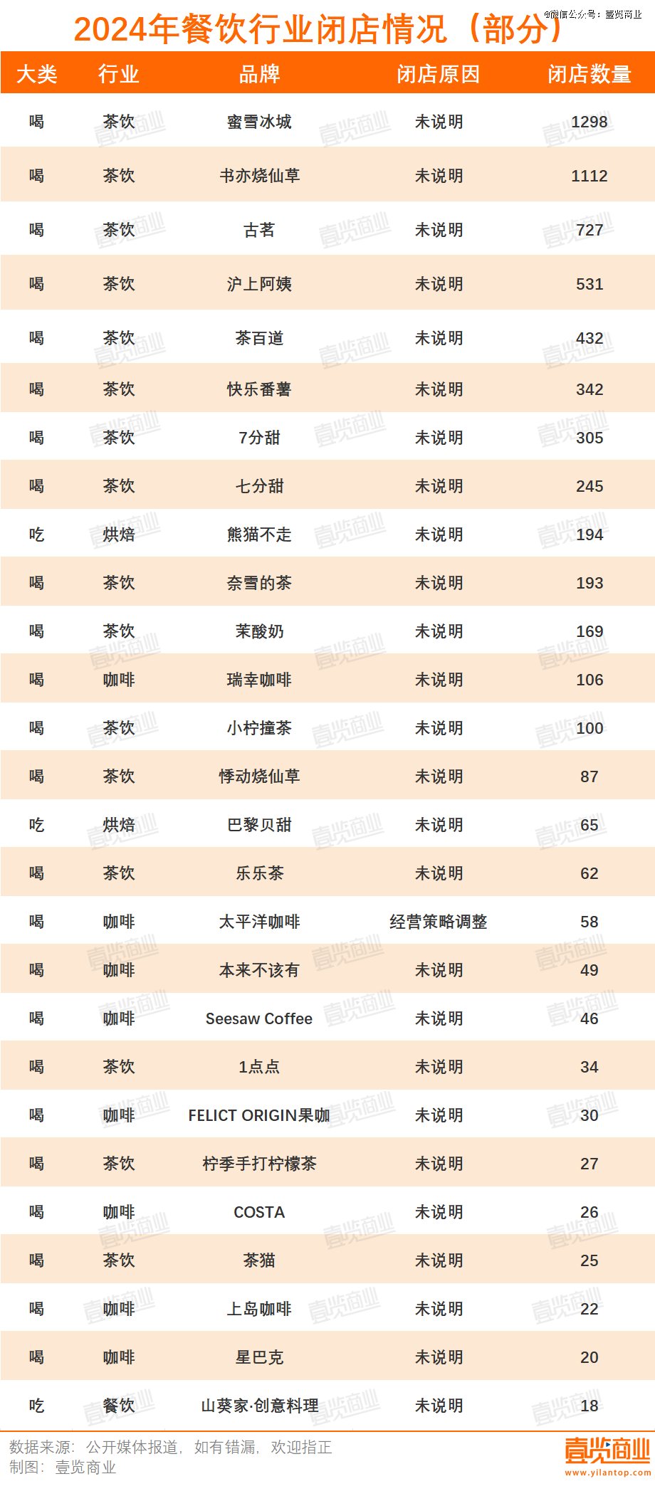 这一年里,行业内卷愈演愈烈,市场洗牌速度加快,竞争态势激烈。在此背景下,大批餐饮品牌黯然离场。据壹览商业不完全统计,2024年,有多个餐饮品牌共关闭了近7000家门店,有近30个餐饮品牌宣布倒闭或调整,其中既有泰鼎丰这样的老牌餐饮品牌,还有如Opera BOMBANA这样的国际餐饮品牌。