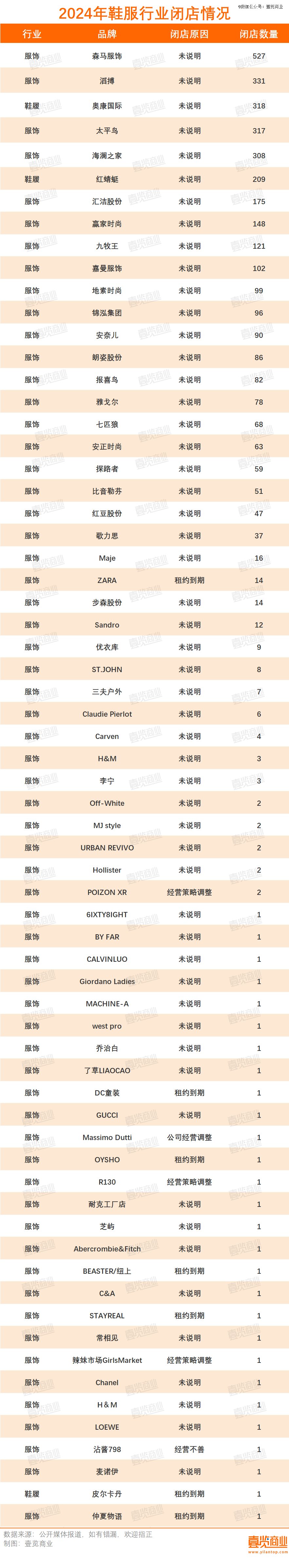 实体店的表现也不容乐观。据壹览商业不完全统计,2024年,鞋服行业至少关闭3546家门店,有11个品牌闭店数量超过百家,森马服饰关闭527家门店、滔搏关闭331家门店、奥康关闭318家门店……