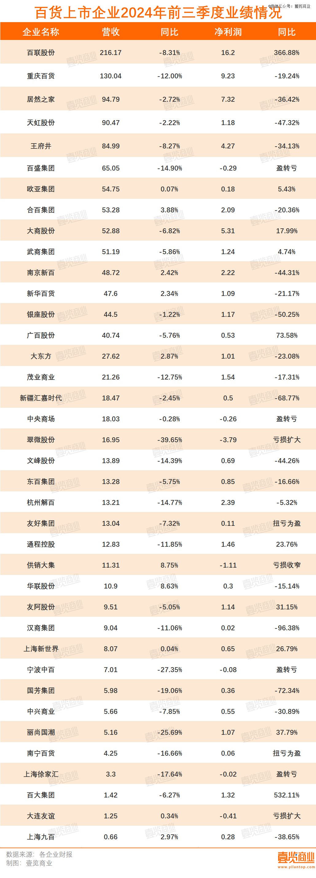 从业绩看,不少百货公司面临盈利困境。2024年前三季度,38家百货上市公司中,仅有10家企业营收实现增长,13家企业净利润实现同比增长(包括亏损收窄),仅占总数的34%,其中友好集团和南宁百货成功扭亏为盈。