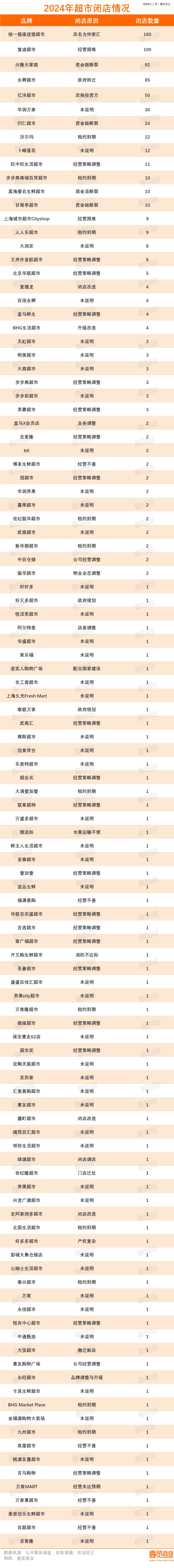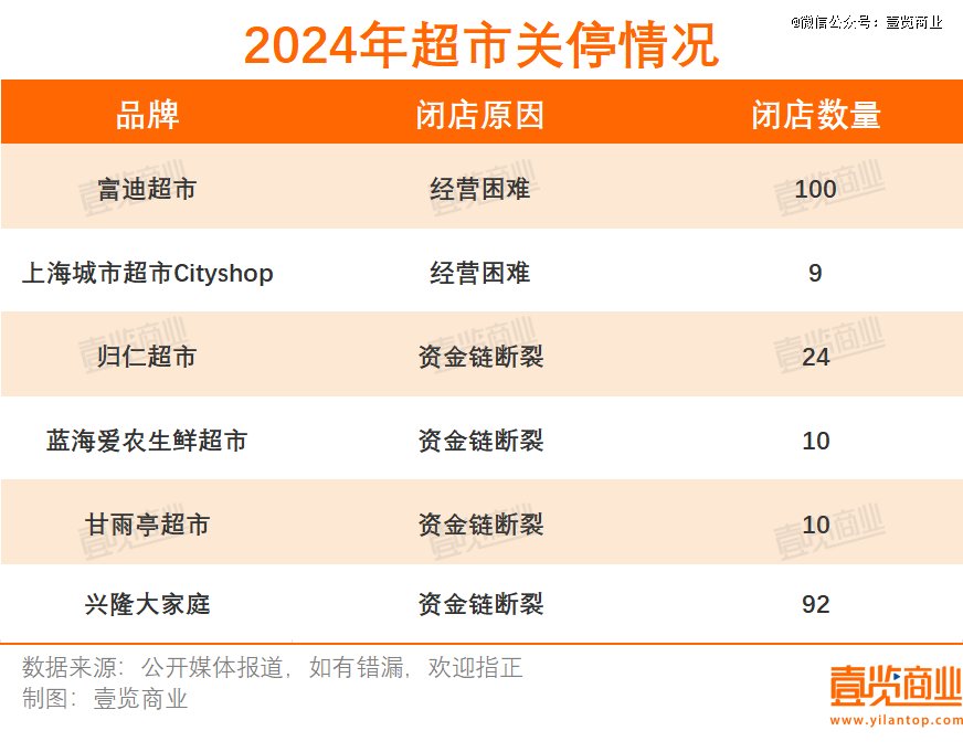 国家统计局数据显示,2024年1—11月份,超市零售额同比增长2.6%,低于大盘增速。据壹览商业不完全统计,2024年,全国至少有782家超市关门,既有卜蜂莲花、步步高超市、永辉超市、大润发、美思佰乐、泉屋超市等全国乃至全球性品牌,也有济南知名商超归仁超市、湖北本土商超富迪超市等区域性品牌。