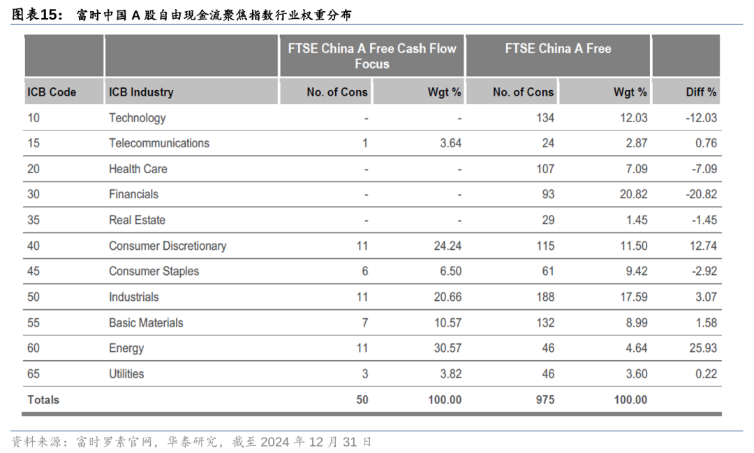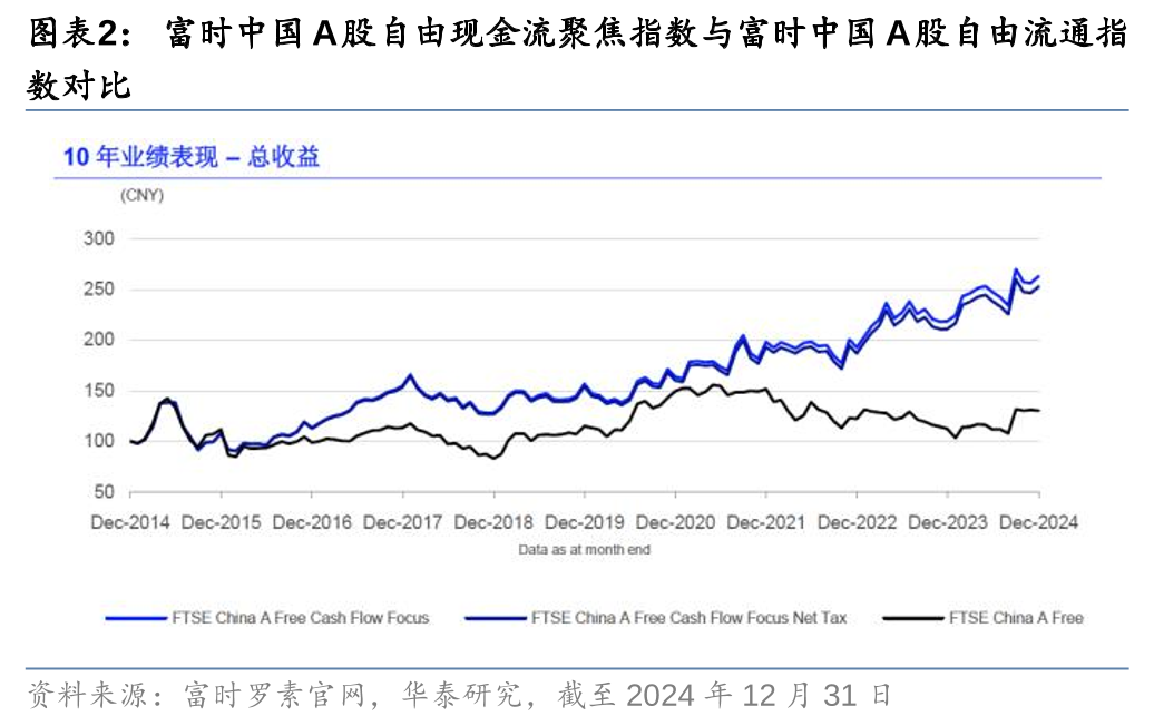 在此背景下,2025年1月10日,国内首批两只自由现金流ETF正式获批,分别为华夏国证自由现金流ETF和国泰富时中国A股自由现金流聚焦ETF。两只基金分别跟踪国证自由现金流指数和富时中国A股自由现金流聚焦指数,均以自由现金流率(自由现金流/企业价值)为主要选股因子,但样本空间和打分方案的细则各有不同。其中,国证自由现金流指数早在2012年底便已发布,2024年下半年对该指数编制进行关键修改,扩大选股范围,剔除金融地产企业,依据流动性、财务质量、盈利稳定性进行负面剔除后,以自由现金流率排名,选取前100只证券构成指数样本。富时中国A股自由现金流聚焦指数发布于2024年,以富时中国A股自由流通指数为样本空间,从流动性、公司质量、成长潜力和波动率等多维度进行负面剔除后,结合自由现金流和股息、收益、账面价值等因素,构建综合打分体系,选取前50只证券作为指数样本。总体来看,两只指数均关注自由现金流和财务质量,而富时指数在股利发放和估值水平上也有一定的考量,相对选样空间,两只指数均录得明显的超额收益。