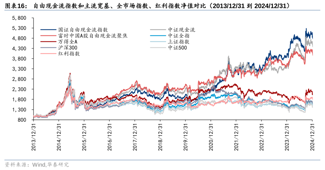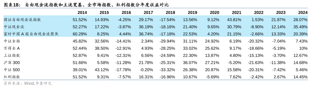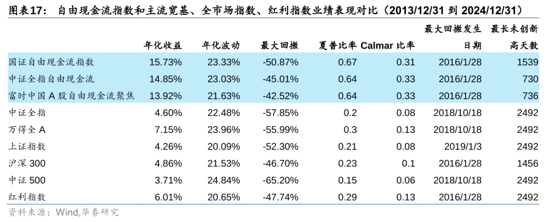 三只指数的业绩表现存在些微差异,但总体上都能跑赢市场,从净值表现来看,2020年之前,自由现金流指数相比大盘宽基、全市场指数、红利指数建立了一定优势,2020年之后更是跑出明显超额收益。2013年末至2024年末,自由现金流指数的夏普比均在0.6左右,年化收益在14%左右,显著高于其他指数。中证和富时指数在回撤控制方面也有不错的表现。富时指数的收益和波动相比境内机构编制的两只指数较小,回撤也更低,可能与其选股因子中纳入了低估值、低波动等因素的考量有关。