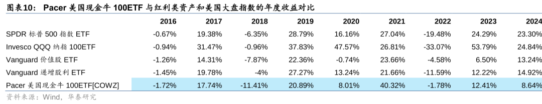 现金流ETF近年来业绩表现优于红利ETF。将COWZ与美股市场上规模最大的价值ETF、红利ETF和标普500ETF、纳斯达克100ETF进行对比,美国现金牛100ETF比Vanguard价值股ETF和Vanguard递增股利ETF在2021-2023年有明显优势,这也解释了为什么2023年多家公司发行现金流相关ETF产品。另外,COWZ的业绩表现在市场下行期更为稳健,2022年美股市场大幅波动,标普500和纳斯达克100ETF跌幅在20%-30%左右,而COWZ仅下跌1.78%。