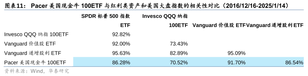 自由现金流产品所受的关注,一方面来自于其自身相对稳健优异的业绩表现,另一方面也源自与成长ETF的较低相关性,在构建ETF投资组合时,一定程度上可以起到分散投资组合集中度、对冲科技股泡沫风险的作用。