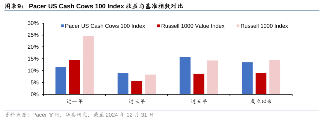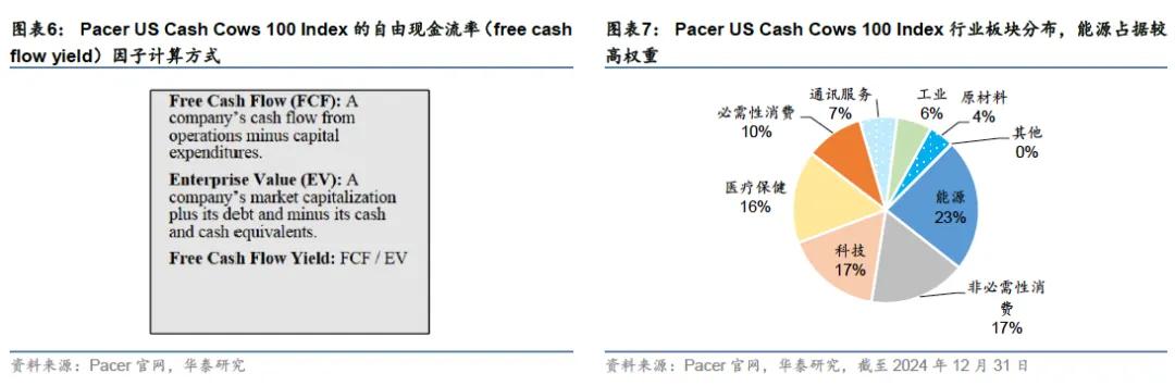 自由现金流选股策略在海外是一个相对成熟的概念,产品案例较为丰富。美国市场自由现金流ETF产品自2016年以来开始发行,Pacer是其中规模最大、发行最早、布局最全的提供商,旗下美国现金牛100 ETF是美国规模最大的自由现金流ETF,截至2025年1月14日,规模约251亿美元,持仓中超配能源板块。该产品持有罗素1000指数成分股中自由现金流率较高的前100只个股,在风格上与价值和红利因子存在相似之处,但长期业绩优于价值和红利因子,且在市场下行期表现稳健,与成长股相关性更低,在市场下行期更可能成为相对安全的“避风港”。