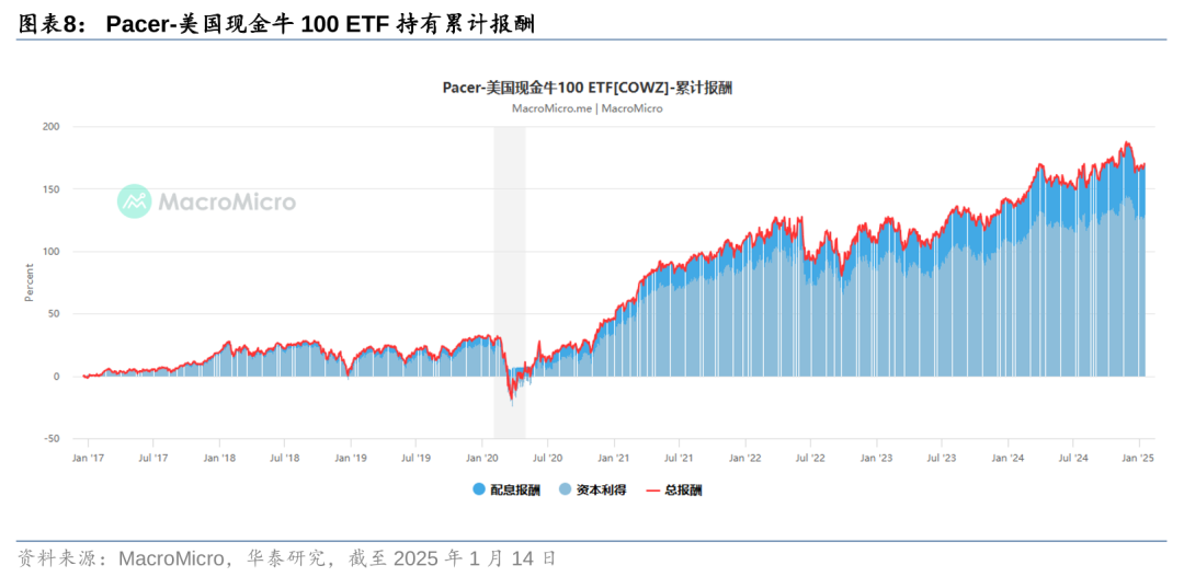 COWZ跟踪Pacer US Cash Cows 100 Index,该指数在罗素1000指数成分股中进行筛选,剔除金融地产企业和预期现金流或盈利为负的企业,按照过去12个月自由现金流率因子进行排序,取排名前100的股票作为成分股。加权方式采用自由现金流加权;再平衡周期为季度,与企业财务报表发布的频率一致;再平衡时,对单只个股设置权重上限,不得超过2%。下图展示了指数的核心因子——自由现金流率的计算方式,可以看出,指数更关注经营活动现金流和资本开支,采用了企业价值(EV)对现金流的量级进行修正,以在不同公司间进行横向对比。总体来看,指数编制方案较为简洁,聚焦美国大盘股中自由现金流率较高的前100只个股。在Pacer公司,该系列ETF产品约10只左右,被称作“现金奶牛系列”。