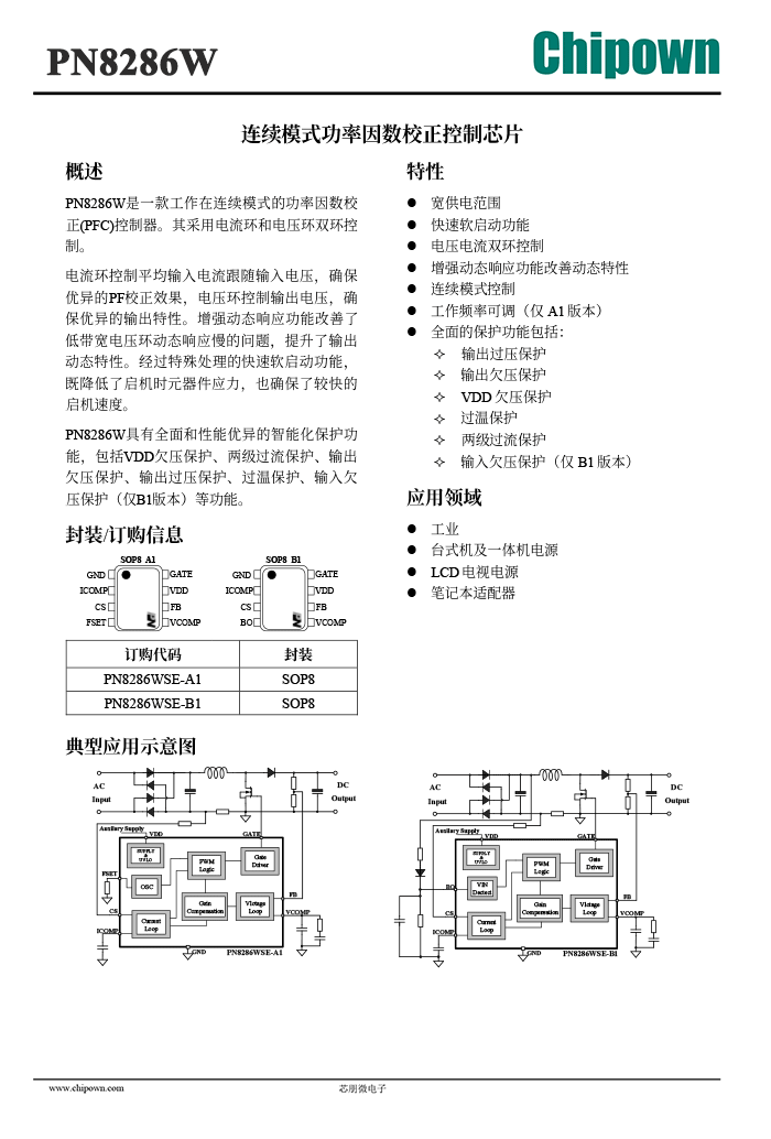 PN8280还可以与flyback或LLC控制芯片一起设计,以实现高效可靠的电源。其适用于各种领域,包括台式机、一体机电源、LCD电视电源、笔记本适配器等。适用的功率范围为90W至500W,采用SOP8封装。