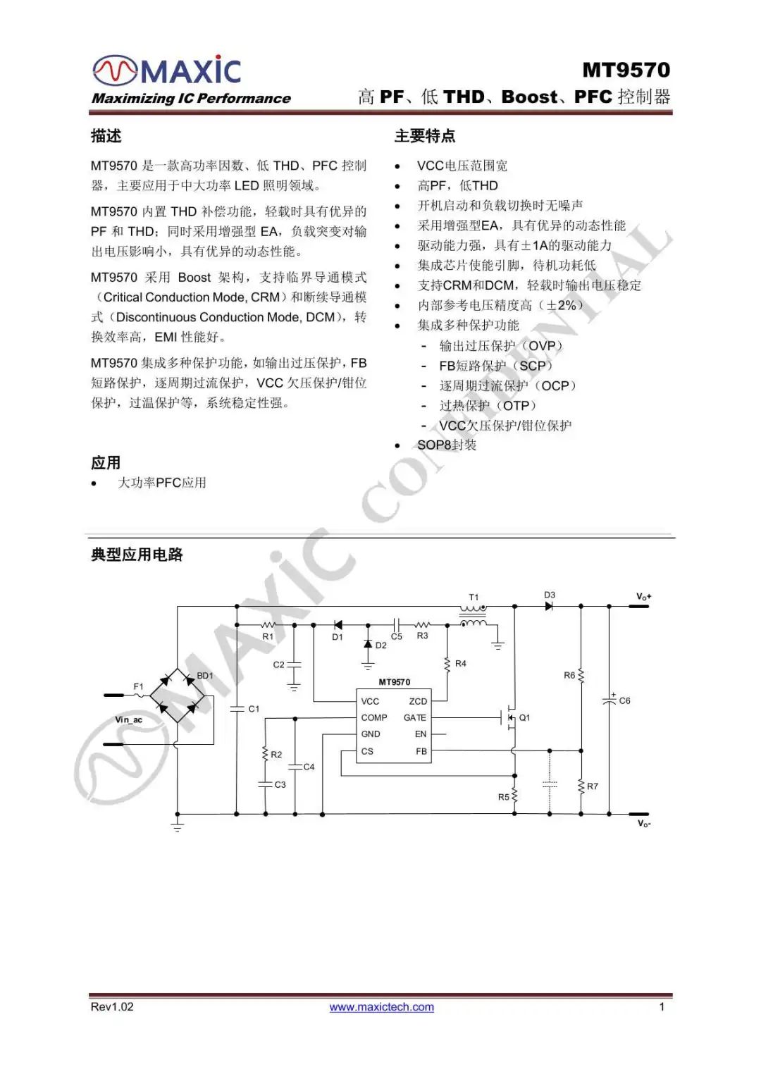 美芯晟基于在电源模拟芯片行业的多年耕耘,推出增强版PFC控制器MT9570,该芯片特点是优化的总谐波失真(THD)性能,从而轻松实现PF>0.99,THD<5%@满载/AC230V,满足IEC61000-3-2标准,同时系统方案支持调光应用,50%负载THD<6%,10%负载THD<20%。