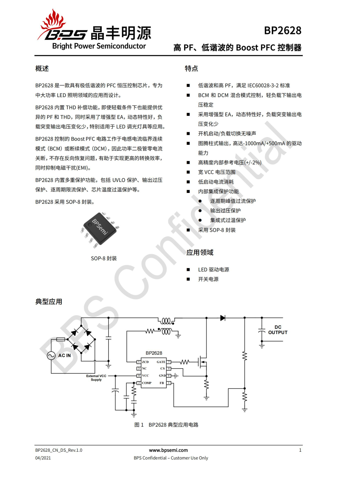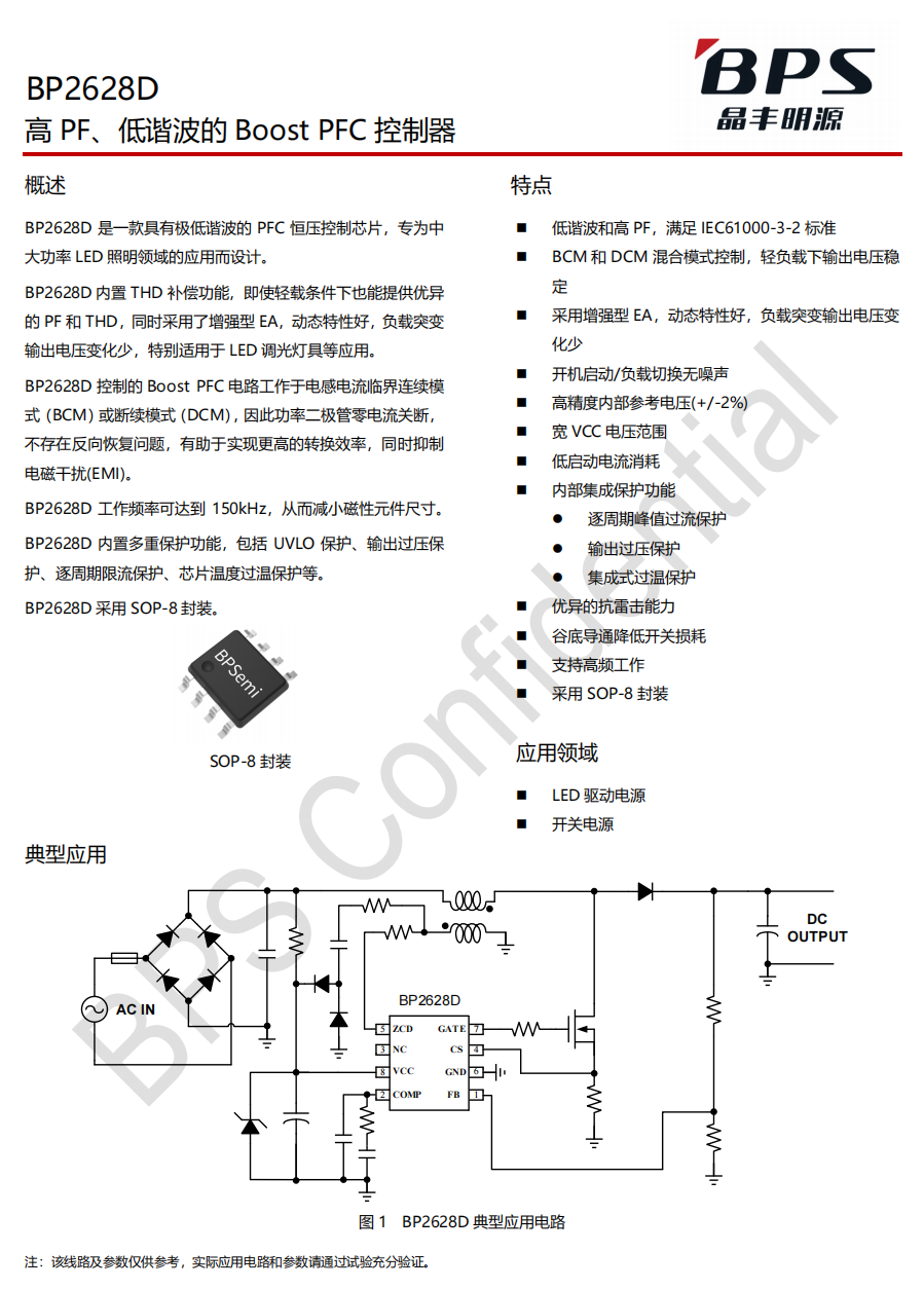 BP2628D 是一款具有极低谐波的 PFC 恒压控制芯片,专为中大功率 LED 照明领域的应用而设计。BP2628D 内置 THD 补偿功能,即使轻载条件下也能提供优异的 PF 和 THD,同时采用了增强型 EA,动态特性好,负载突变输出电压变化少,特别适用于 LED 调光灯具等应用。BP2628D 控制的 Boost PFC 电路工作于电感电流临界连续模式(BCM)或断续模式(DCM),因此功率二极管零电流关断,不存在反向恢复问题,有助于实现更高的转换效率,同时抑制电磁干扰(EMI)。