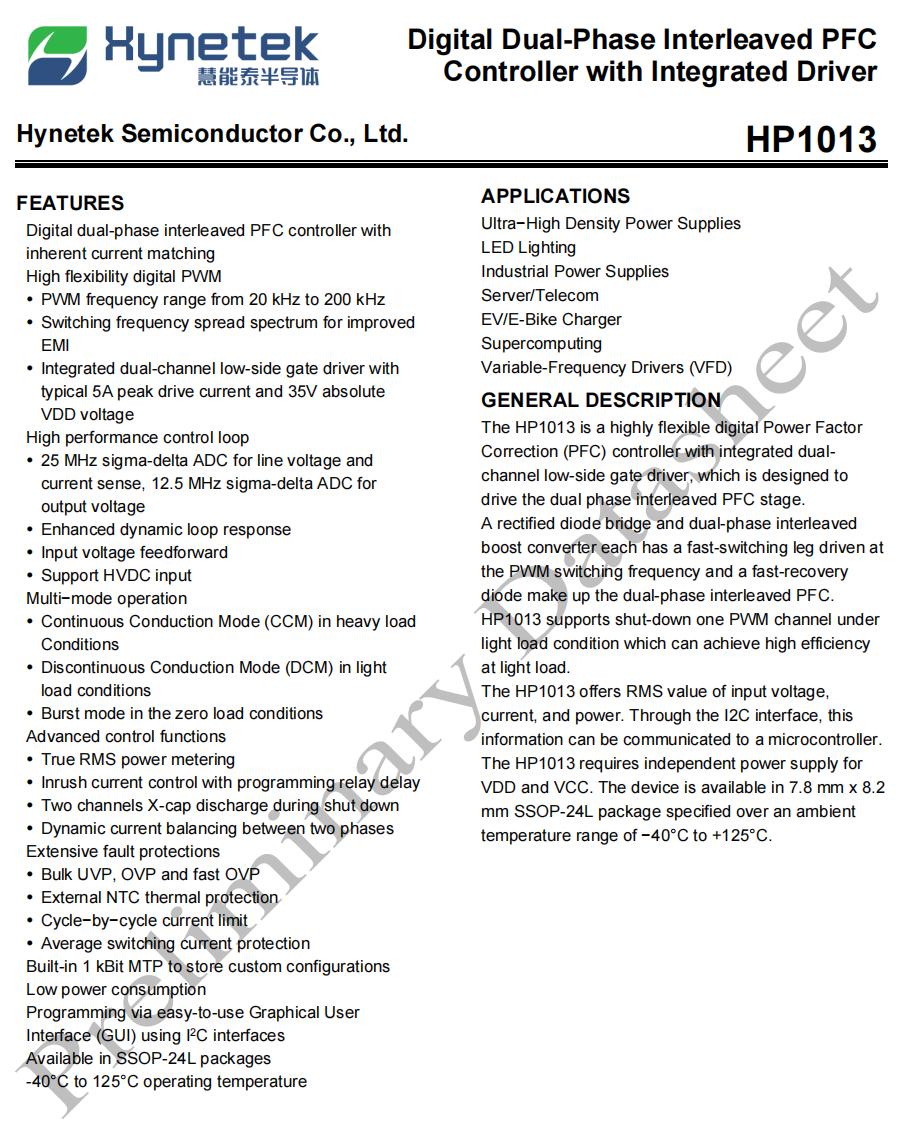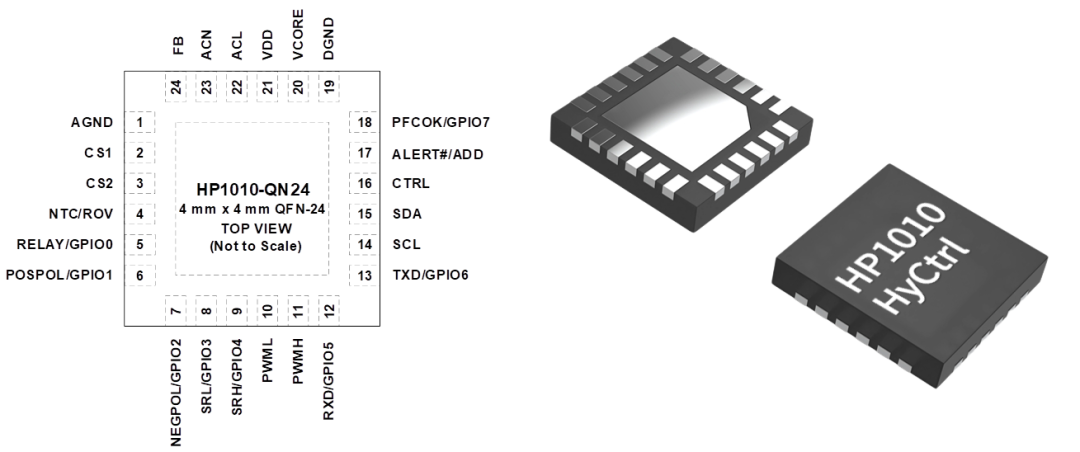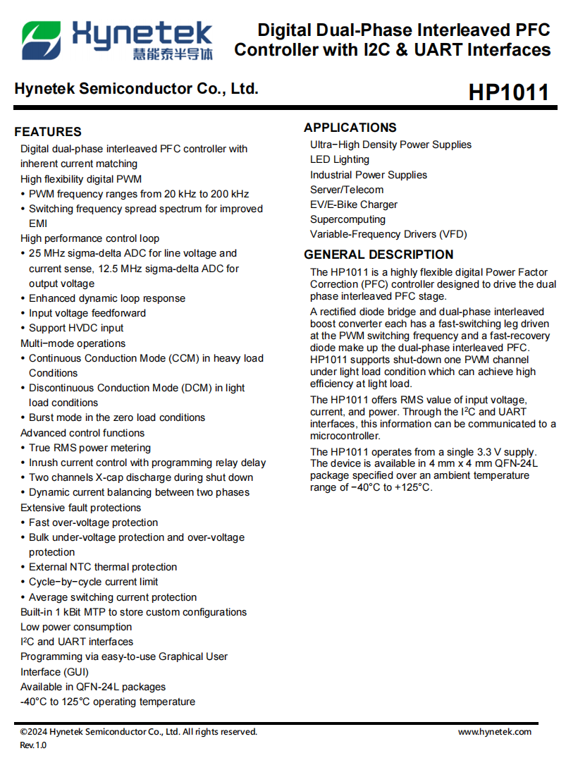HP1011是一款高度灵活的数字功率因数校正(PFC)控制器,专为驱动双相交错PFC级设计。整流二极管桥和双相交错升压转换器的每一相都包含一个以PWM开关频率驱动的快速切换级和一个快速恢复二极管,组成双相交错PFC。HP1011在轻载条件下支持关闭一个PWM通道,从而实现轻载高效率。该控制器提供输入电压、电流和功率的RMS值,并通过I2C和UART接口将这些信息传输给微控制器。HP1011由单一的3.3V电源供电,采用4mm x 4mm QFN-24L封装,工作环境温度范围为-40°C至+125°C。