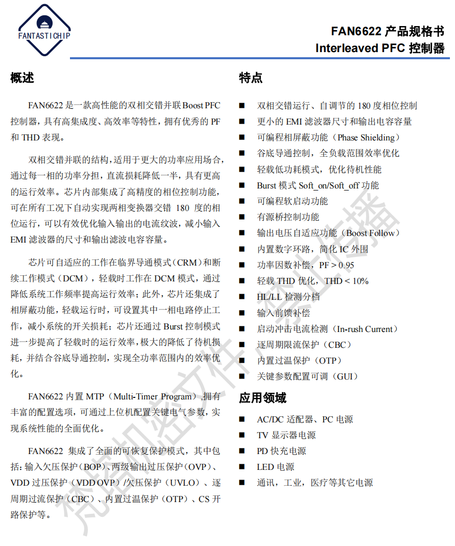 FAN6622是一款高性能双相交错并联Boost PFC控制器,具有高集成度和高效率,提供出色的功率因数(PF)和总谐波失真(THD)表现。其双相交错结构适用于大功率应用,降低直流损耗并提高运行效率。芯片集成高精度相位控制,自动实现180度交错运行,优化电流纹波并减小EMI滤波器和输出电容的尺寸。它支持临界导通模式(CRM)和断续模式(DCM),并通过相屏蔽和Burst控制等功能进一步优化轻载效率。内置MTP程序提供丰富配置选项,实现系统性能优化,且集成全面的可恢复保护模式,包括欠压、过压、过流和过温保护等。