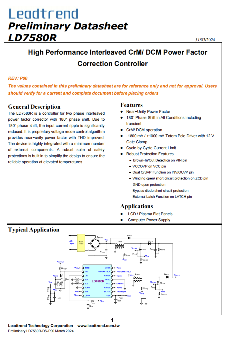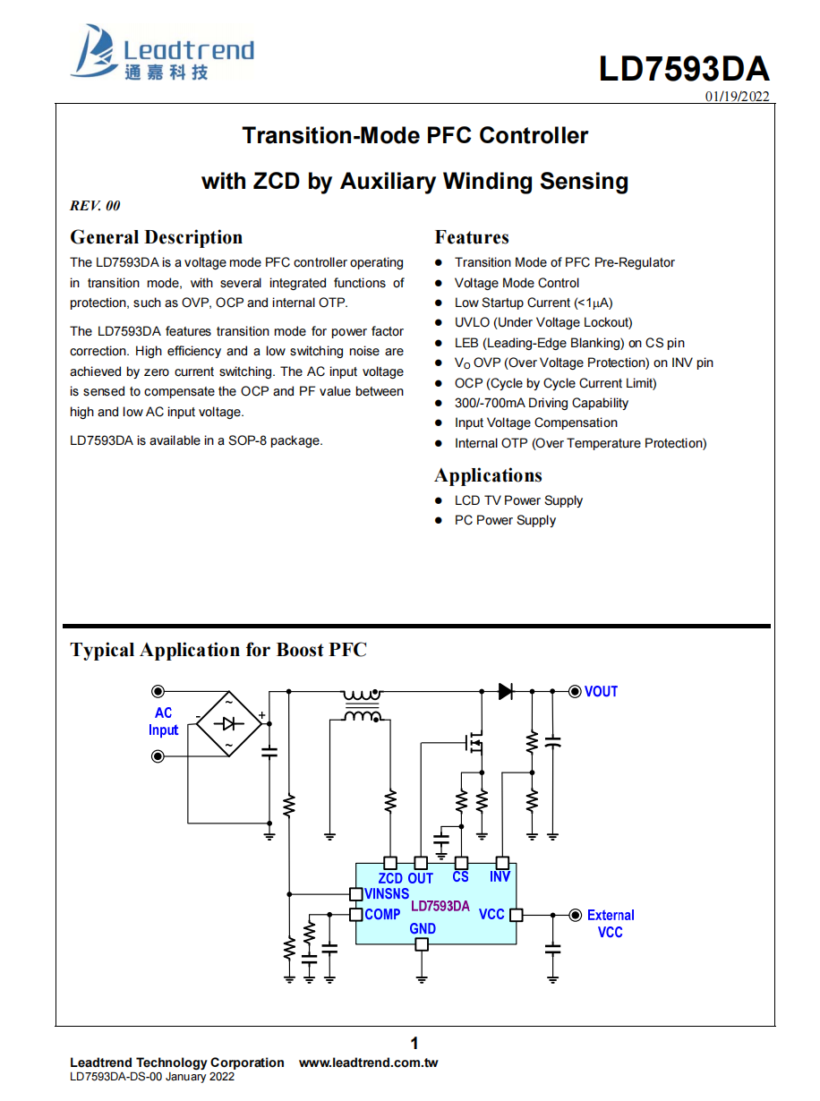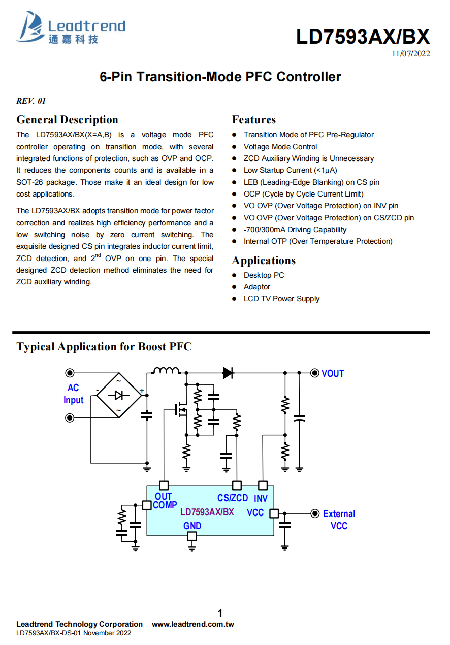 LD7593AX/BX是一系列采用电压模式的PFC控制器,运行在过渡模式下,并集成了多种保护功能,包括过压保护和过电流保护,可大大减少了周边元件数量,封装为SOT-26,非常适用于低成本应用。