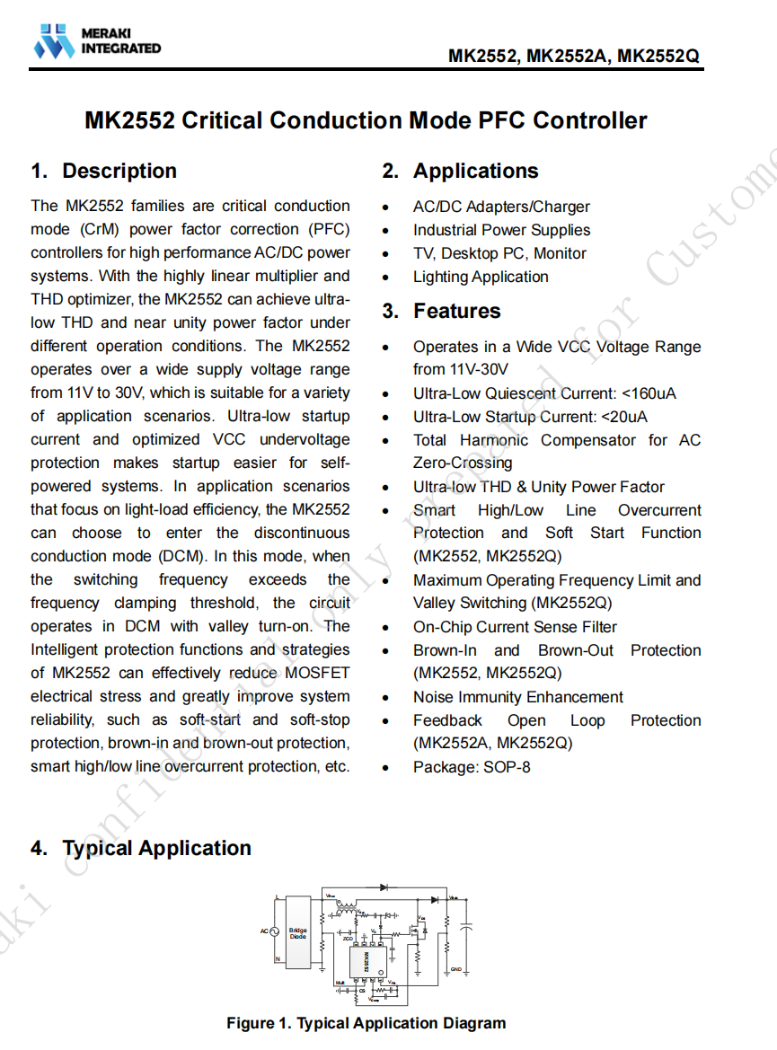 MK2552 是一款临界导通模式(CrM)PFC控制器,专为高性能 AC/DC 电源系统设计。它具有高度线性的乘法器和谐波失真优化器,能够在不同工作条件下实现超低谐波失真(THD)和接近于单位的功率因数。