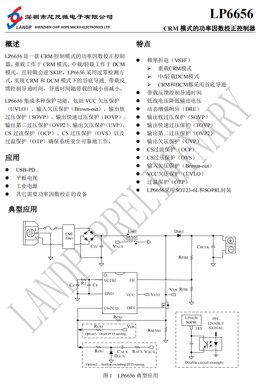 LP6656 是一款 CRM 控制模式的功率因数校正控制器。重载工作于 CRM 模式,中载/轻载工作于 DCM模式,且轻载会进 SKIP。LP6656 采用过零检测方式,实现 CRM 和 DCM 模式下的谷底导通; 带载反馈控制导通时间,导通时间随带载的减小而减小。
