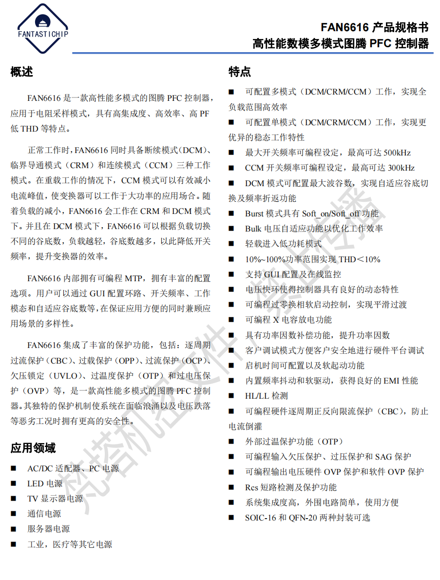 FAN6616是一款集成了多种功能的图腾柱PFC控制器,它采用基于峰值电流控制的CCM/CRM/DCM多模式工作机制,具备自适应DCM谷底切换工作能力,支持超过300kHz的高频操作,并通过过零点软起控制技术,实现平滑的交流电流过零点,减少开关损耗。此外,FAN6616还支持UART在线通讯,具有功率计功能,内置BOOST Follower功能,允许输出电压跟随输入电压,同时具备抗浪涌设计,增强了电源系统的稳定性和可靠性。