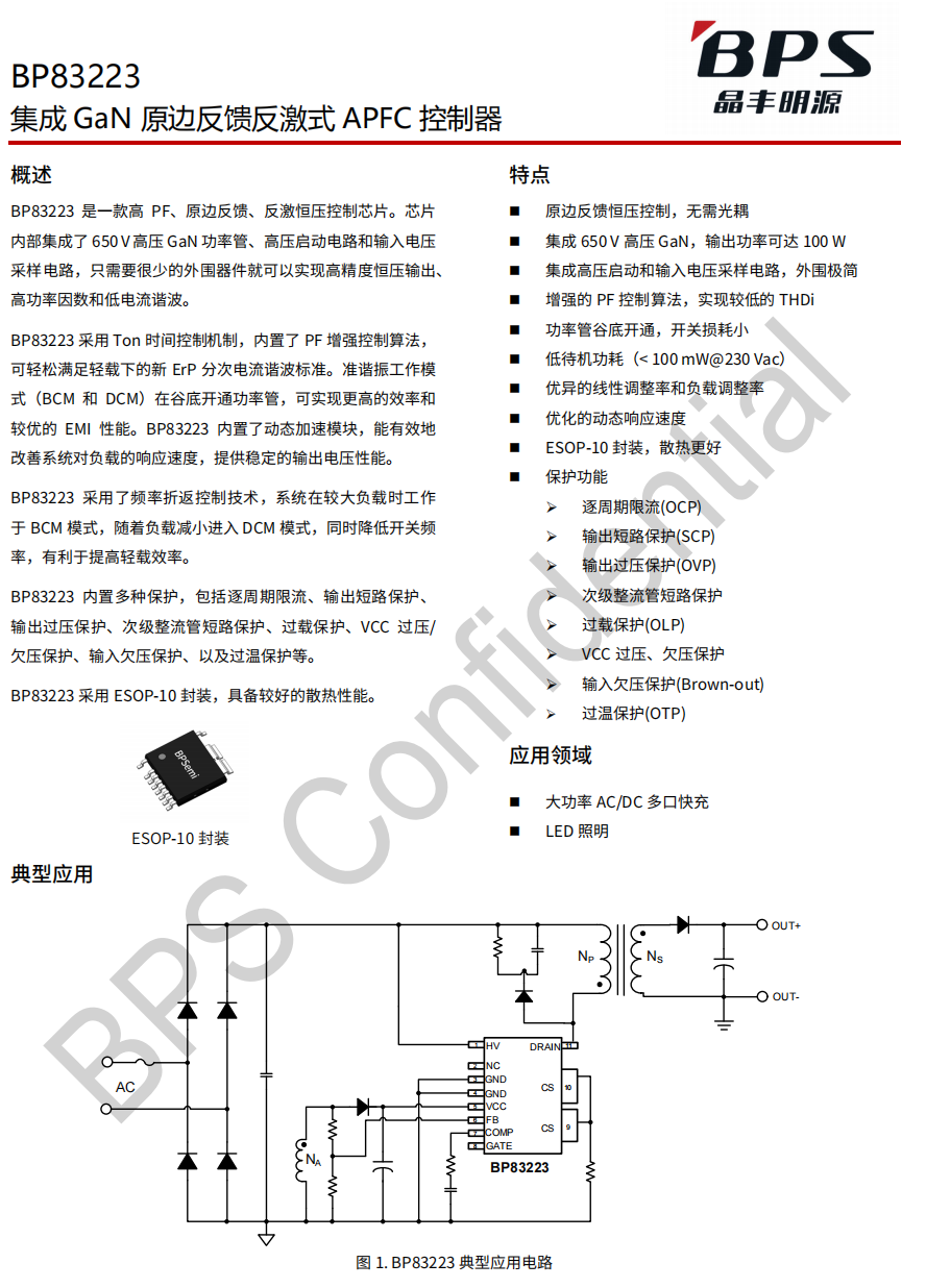 BP83223 是一款集成了 650V 高压 GaN 功率管的高功率因数、原边反馈反激恒压控制芯片,具有高压启动和输入电压采样电路,能以极少的外围元件实现高精度恒压输出、低电流谐波。采用 Ton 时间控制机制和 PF 增强算法,满足新 ErP 标准的轻载分次谐波要求。芯片支持准谐振工作模式(BCM 和 DCM),通过谷底开通提升效率和 EMI 性能,内置动态加速模块提升负载响应速度,并通过频率折返技术在不同负载下优化效率。多重保护机制包括限流、短路、过压、欠压、过温等,采用 ESOP-10封装。