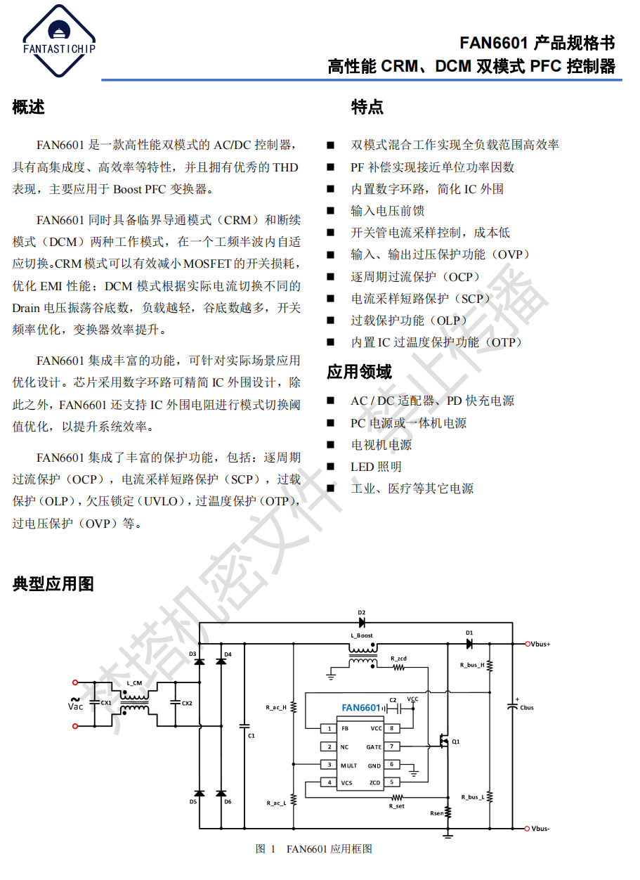 FAN6601是一款高性能双模式AC/DC控制器,具有高集成度和高效率,表现出优秀的THD性能,适用于Boost PFC变换器。其支持临界导通模式(CRM)和断续模式(DCM)自适应切换,CRM模式可减少MOSFET开关损耗并优化EMI性能,DCM模式则通过调节开关频率提升转换器效率。FAN6601集成了丰富的功能与保护机制,支持数字环路和外围电阻优化,提供了过流保护(OCP)、短路保护(SCP)、过载保护(OLP)、欠压锁定(UVLO)、过温度保护(OTP)和过电压保护(OVP)等全面保护。