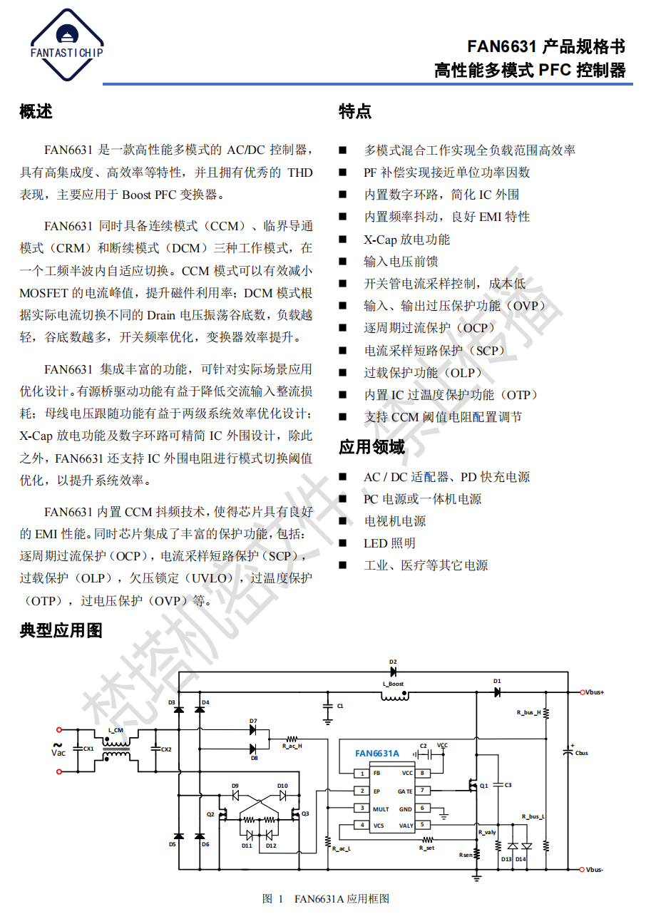 FAN6631是一款高性能多模式AC/DC控制器,具有高集成度和高效率,主要用于Boost PFC变换器,表现出色的总谐波失真(THD)。它支持连续模式(CCM)、临界导通模式(CRM)和断续模式(DCM),可在工频半波内自适应切换,优化MOSFET电流峰值和开关频率,从而提高变换器效率。FAN6631集成有源桥驱动、母线电压跟随及X-Cap放电功能,简化外围设计并提升系统效率。芯片还内置CCM抖频技术,提供优良的EMI性能,且具备全面的保护功能,包括过流、短路、过载、欠压、过温和过压保护等。
