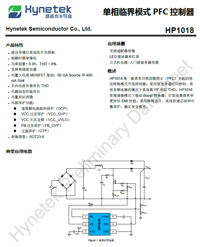 HP1018是一款高性能的CrM模式Boost PFC控制器,采用COT控制方案,无需无线电压检测即可实现接近单位功率因数。其设计支持与XXX28056的Pin to Pin兼容替代,并通过无辅助绕组方式实现波谷导通,从而有效降低开关损耗。