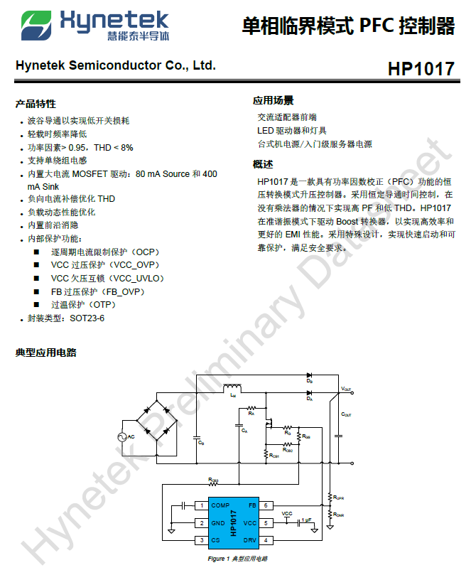 此外,HP1017采用负向电流补偿技术,在优化谐波总失真(THD)方面表现出色,并支持灵活配置软启动时间,以满足多种应用需求。为保障系统安全,HP1017配备全面的故障保护机制,包括VCC过压保护、欠压保护、输出过压保护、逐周期电流限制和内置过温保护,确保设备在多种工况下稳定可靠运行。