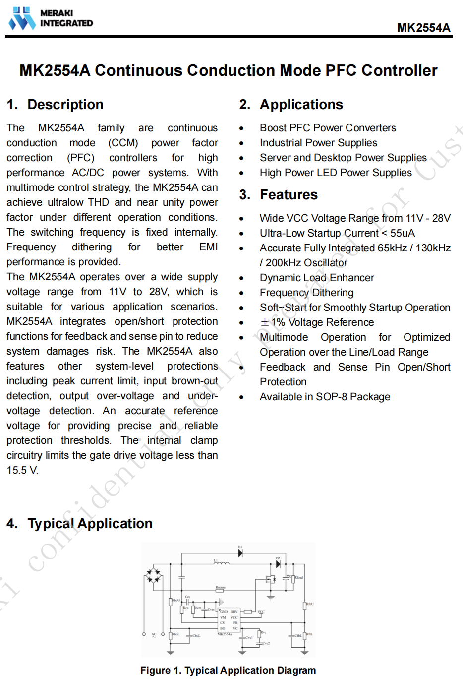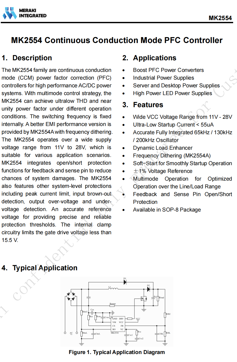 MK2554 系列是用于高性能 AC/DC 电源系统的连续导通模式 (CCM) 功率因数校正 (PFC) 控制器。通过多模式控制策略,MK2554 能在不同的工作条件下实现超低谐波失真 (THD) 和接近单位的功率因数。开关频率内部固定,MK2554A 型号通过频率抖动提供更好的 EMI 性能。