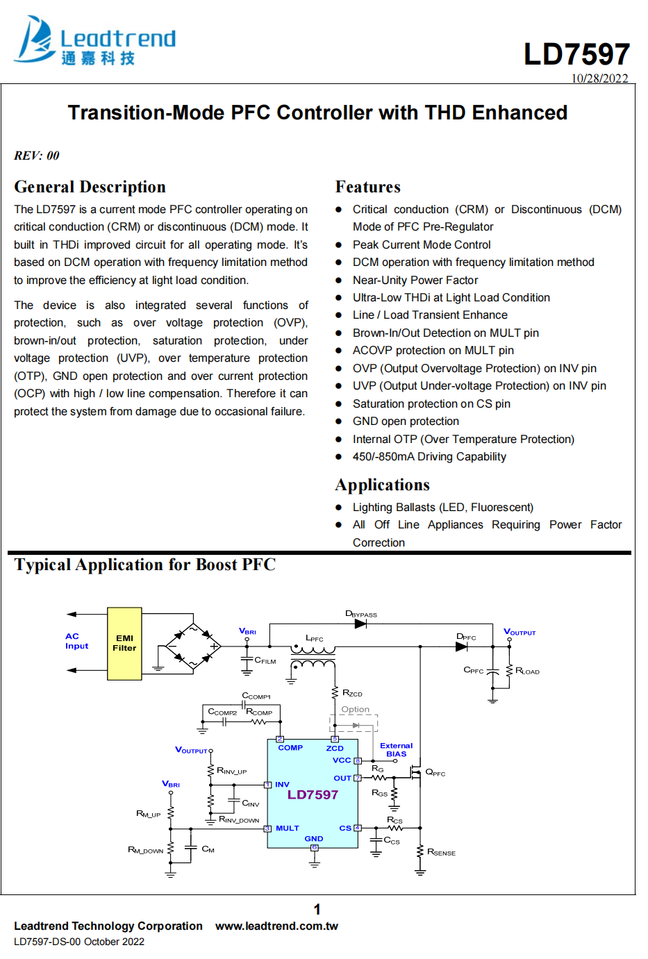 LD7597是一款采用电流模式的PFC控制器芯片,可在临界导通(CRM)或间断导通(DCM)模式下运行。它内置了用于改善各种工作模式的THDi的电路。该控制器以DCM操作为基础,采用频率限制方法来提高在轻负载条件下的效率。