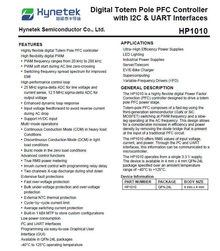 为了实现图腾柱无桥 PFC 的高效要求并克服它带来的各种挑战,慧能泰推出了业界首款图腾柱无桥 PFC 专用数字控制器 HP1010,其数字架构基于高速数字状态机架构,并集成了高性能模拟前端以及高速比较器,确保了图腾柱无桥 PFC 的高性能实时控制。HP1010 提供的逐周期限流保护 (CBC) 可有效避免因电源电压异常波动过程中引起的过电流问题,浪涌电压保护功能可以使在浪涌过电压尤其是正半周反向雷击、负半周正向雷击时快速关断慢速同步整流管,有效增强图腾柱无桥 PFC 的稳定性和可靠性。此外,HP1010 还集成了丰富的可编程保护功能,包括:输入电压过压/欠压保护、输出电压过压/欠压保护、输出反馈电压开路保护等,保护功能参数与使能均可独立配置。