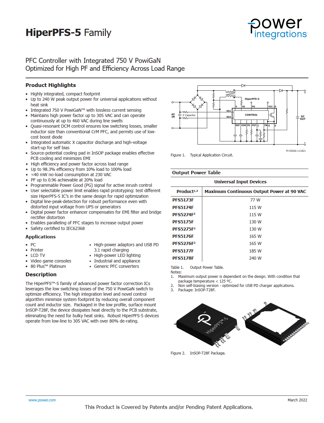 PI高级产品营销经理Edward Ong表示:“在OEM原厂和非原厂供应商竞相为移动设备推出最快、最小、最通用的USB PD充电器的背景之下,HiperPFS-5 IC可以为工程师提供关键优势。我们做到了将PI特有的PowiGaN开关与准谐振、变频非连续导通模式升压PFC拓扑结构相结合。而如果将HiperPFS-5 IC与我们新推出的HiperLCS2芯片组或InnoSwitch4-CZ有源钳位反激IC搭配使用,设计工程师可以轻松超越最严格的效率标准,同时将物料清单缩减一半,设计出精致小巧的超快速充电器。”