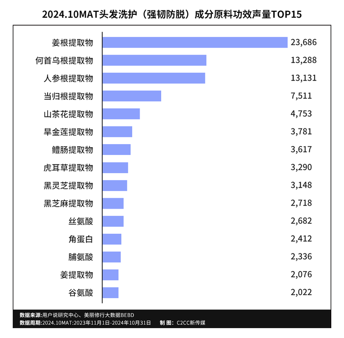 前文提到,在近12个月的时间跨度内,人参根提取物应用产品的备案数量近0.6万件,增长率高达79%。用户说数据还显示,在社媒声量端,人参根提取物同比增长率高达11742.9%,充分彰显了其在护发领域所获得的广泛应用与高度关注。