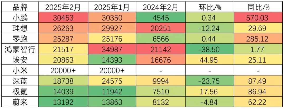 2月的第一再度由小鹏坐稳,2025年的小鹏汽车可谓是风光无限,从1月份顺利夺回销量冠军之后,在2月份继续坐稳了这个位置,而且坐得更加牢固,在有数据的造车新势力中,是唯一一家月销量突破3万辆的。