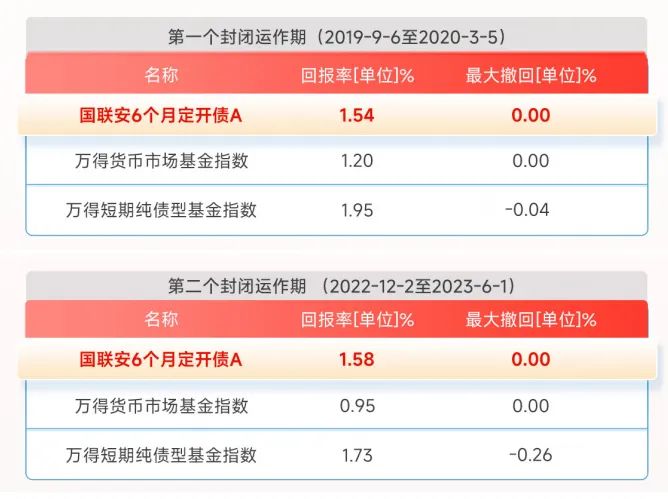 相较于同期短债基金指数,国联安6个月定开债历史回撤更小;相较货币市场基金,国联安6个月定开债历史回报率更高。