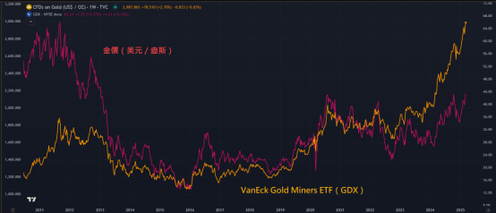 自2024年初以来,金价累计上涨约45%;若依回归线推算,GDX理应上涨约80%,而非当前的39%。换言之,若GDX回归与金价的历史关联,且假设其他市场因素不变,则仍有约30%的潜在上升空间。