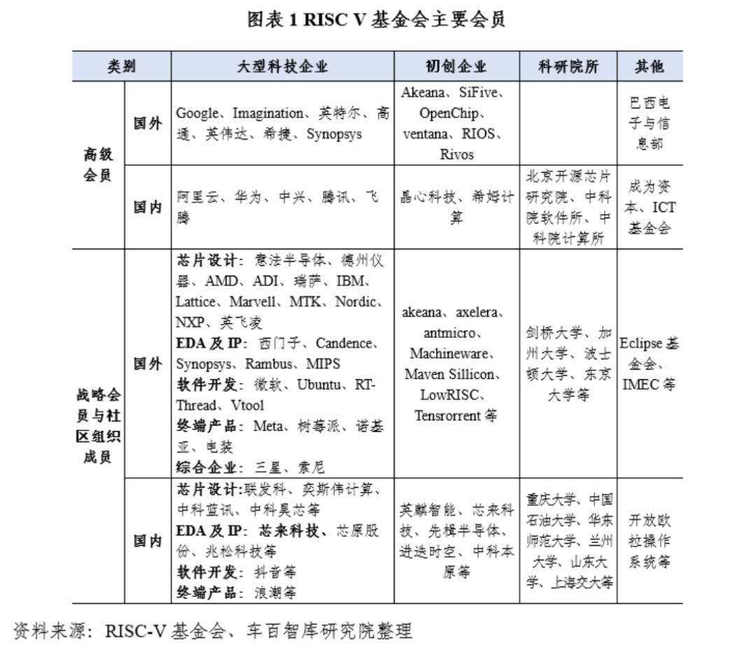 截至2024年11月,RISC-V国际基金会共计有来自70多个国家的会员单位数量超4400个,中国占比一半,其中25个高级会员单位(有董事会席位及技术委员会席位)中有12个来自中国(见图表1),可直接影响RISC-V标准的制定和技术发展方向。