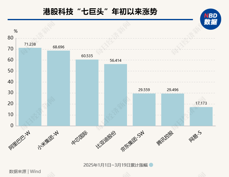Choice数据显示,2025年初,港股科技“七巨头”的总市值为8.19万亿港元,而截至3月19日,这一数字已飙升至11.85万亿港元,涨幅超44%。这与美股“七巨头”形成了鲜明对比。