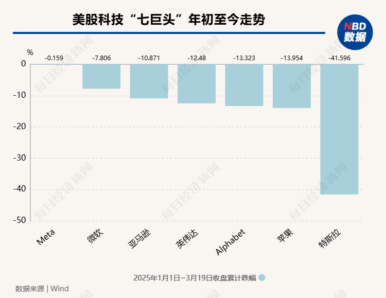 而与中国科技股的强劲表现形成鲜明对比的是,美股科技“七巨头”同期整体表现相对弱势,以美股科技股为主的纳斯达克指数持续调整,反映出市场对特朗普政策的担忧。
