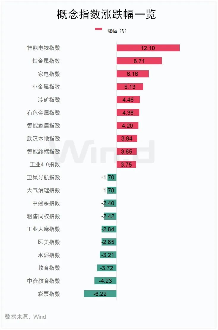 从盘面来看,Wind概念板块多数上涨,智能电视指数涨12.1%,钴金属指数涨8.71%,家电指数涨6.16%。跌幅方面,彩票指数领跌6.22%,中资教育指数跌4.23%,教育指数跌3.72%。