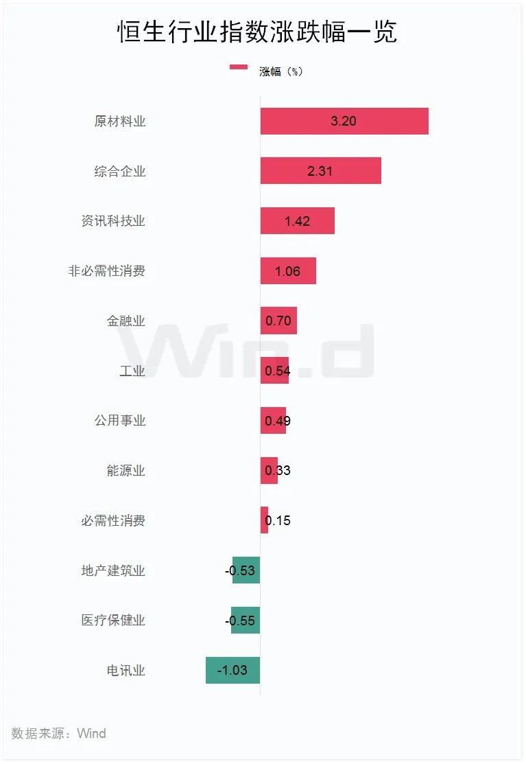 从行业表现看,恒生行业指数日内多数上涨,原材料业指数涨3.2%,综合企业指数涨2.31%,资讯科技业指数涨1.42%。跌幅方面,电讯业指数跌1.03%,医疗保健业指数跌0.55%,地产建筑业指数跌0.53%。