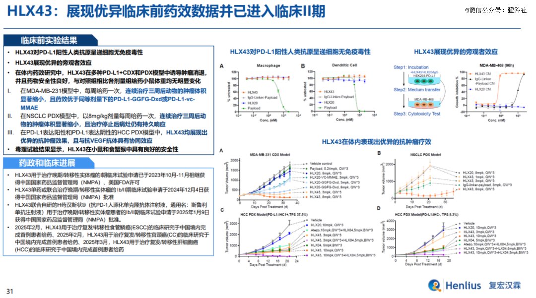 最值得一提莫过于复宏汉霖的PD-L1 ADC产品HLX43,其处于临床二期阶段(进度全球第二),并且有着潜在BIC的潜力。