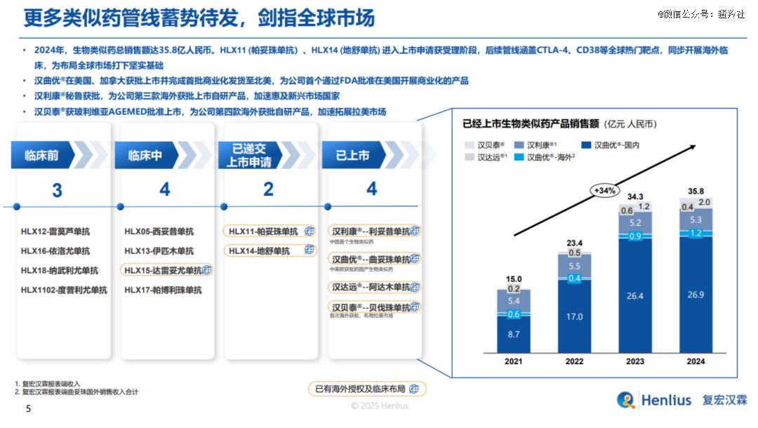 汉曲优在2024年4月和8月分别于美国和加拿大获批上市,并在2024年11月完成首批美国商业化发货,预计2025年将开始释放其美国市场潜力;同年汉曲优在巴西和墨西哥等拉美主流市场获批上市,中东地区完成沙特发货,成为该地区*国产单抗生物类似药。
