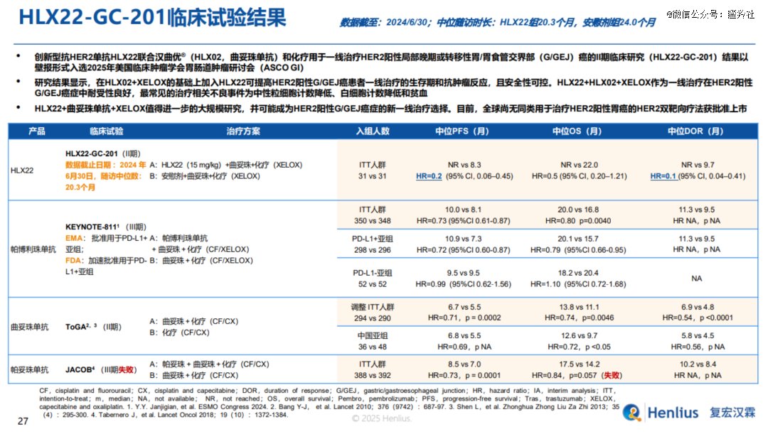 尽管HLX22-GC-201研究样本量较小,但非头对头比较KEYNOTE-811研究,HLX22相比K药加入曲妥珠单抗和XELOX更能够显著提升一线胃癌患者的mPFS。