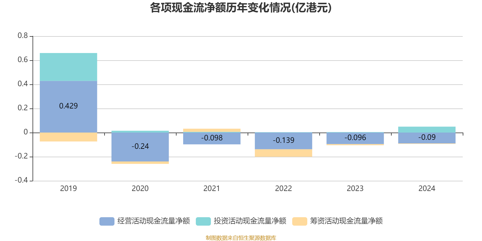 2024年,公司经营活动现金流净额为-904.6万港元,同比增加57.6万港元;筹资活动现金流净额-43.9万港元,同比增加49.9万港元;投资活动现金流净额493.4万港元,上年同期为38万港元。